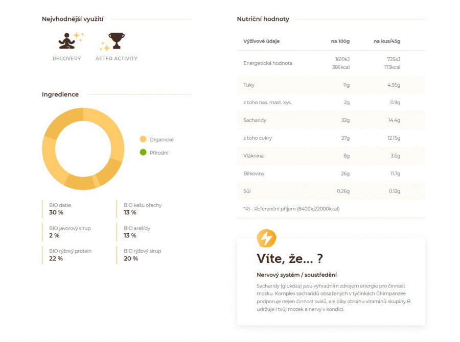 Chimpanzee Organic Protein Bar obsahuje lehce stravitelné rostlinné bílkoviny v bio kvalitě. Základem této tyčinky jsou bio datle, bio protein z hnědé rýže a bio mandlová pasta. Díky tomu vám tyčinka dodá elán a sílu, aniž byste zatěžovali trávicí systém. Podporuje metabolismus bílkovin, který je