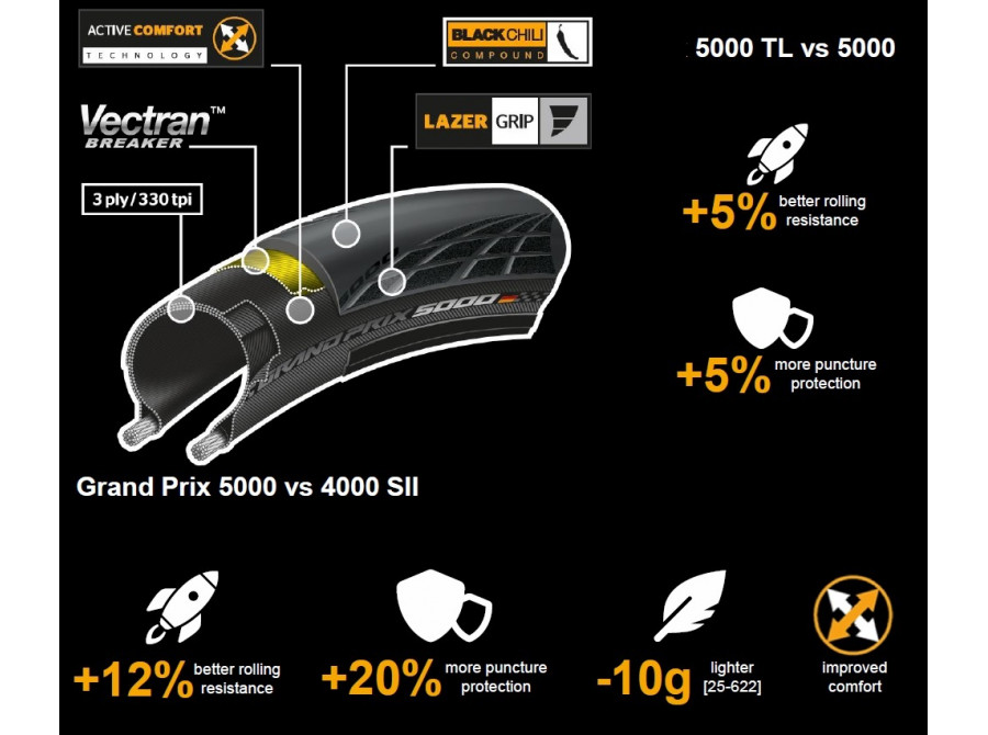 Continental Grand Prix 5000 je nový silniční plášť pro závodní použití, který nahrazuje legendární a v profi pelotonu nejpoužívanější Grand Prix 4000. Díky mnoha letům vývoje se podařilo snížit hmotnost a valivý odpor pláště a naopak zvýšit odolnost proti defektům.
