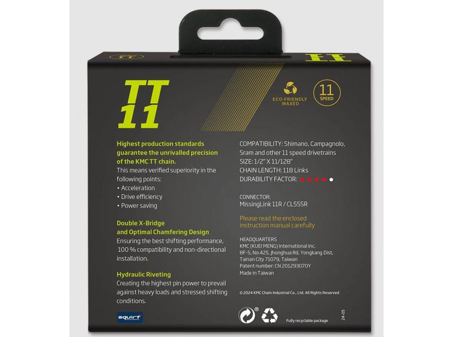 Prémiový řetěz KMC TT11 Neo Chrome je navržen speciálně pro maximální výkon v triatlonu a časovkách. Díky technologii Double X-Bridge nabízí extrémně přesné a rychlé řazení, voskování KMC GO Wax zase přináší vyšší účinnost, menší opotřebení a snazší údržbu.