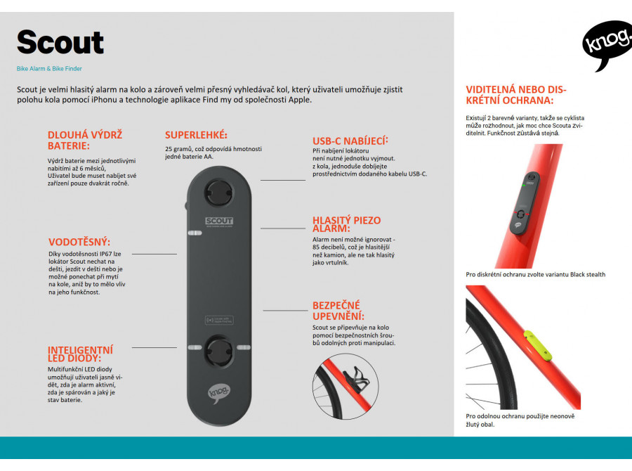KNOG Scout je lehký a nízkoprofilový lokátor a alarm pro jízdní kola navržený tak, aby se bez problémů integroval do sítě produktů FindMy od Apple, a umožňuje sledovat, kde se kolo nachází, i když není zrovna v pohybu. Připevnění je diskrétní a bezpečné pod jakýkoli košík na láhev pomocí dodávaných bezpečnostních šroubů. Zařízení se dobíjí přes USB-C a při běžném používání vydrží v provozu přibližně 6 měsíců. Cyklisté mohou aktivovat/deaktivovat alarm citlivý na pohyb, lokalizovat zařízení a kontrolovat výdrž baterie prostřednictvím aplikace Knog.
