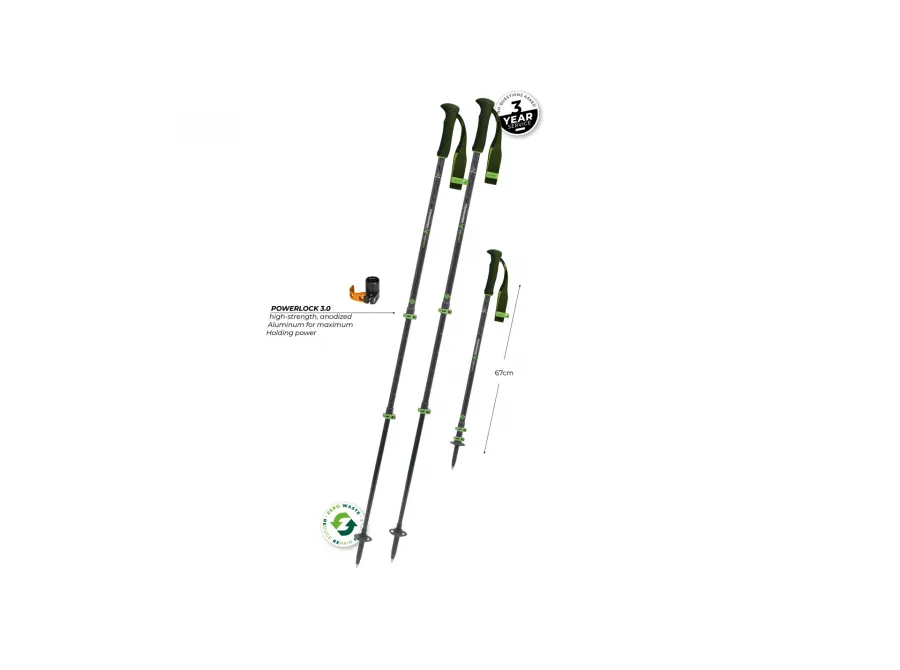 Třídílná konstrukce s karbonovými částmi (O 18 a 16 mm) a Titanal.HF spodní částí (O 14 mm) zajišťuje ideální kombinaci lehkosti a pevnosti. Hmotnost 213 g poskytuje skvělý poměr mezi odolností a komfortem, což znamená, že i dlouhé túry s těmito hůlkami nebudou zbytečně těžké. Powerlock 3.0 systém garantuje rychlé a stabilní nastavení délky.