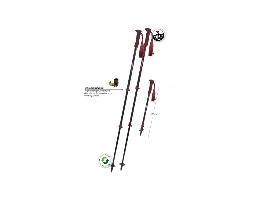 Třídílná konstrukce s karbonovými částmi (O 18 a 16 mm) a Titanal HF spodní částí (O 14 mm) nabízí vynikající rovnováhu mezi lehkostí a odolností, přičemž hmotnost 193 g činí hůlky extrémně pohodlnými na dlouhé výlety. Powerlock 3.0 systém zaručuje rychlé, snadné a bezpečné nastavení délky.