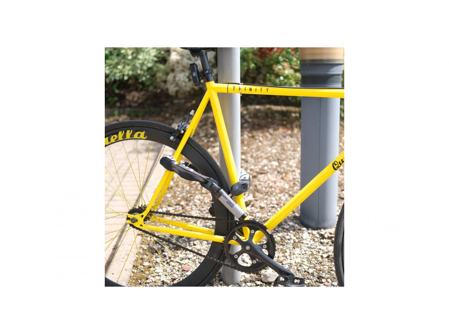 Bezpečný řetězový zámek s 4místnou číselnou kombinací, ideální pro každodenní použití ve městě i na výletech. Řetěz z tvrzené oceli o průměru 9,5 mm je dlouhý 90 cm a chráněný textilním obalem proti poškrábání rámu. Zámek je odolný proti běžným pokusům o přeřezání nebo páčení a díky kombinaci odpadá starost s klíči.