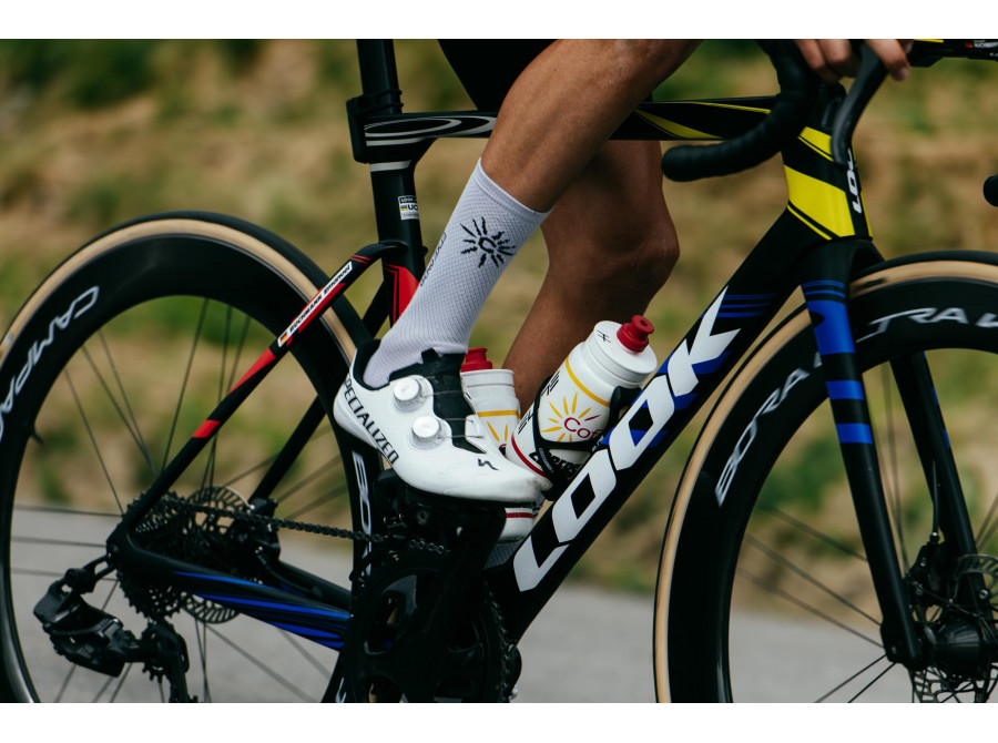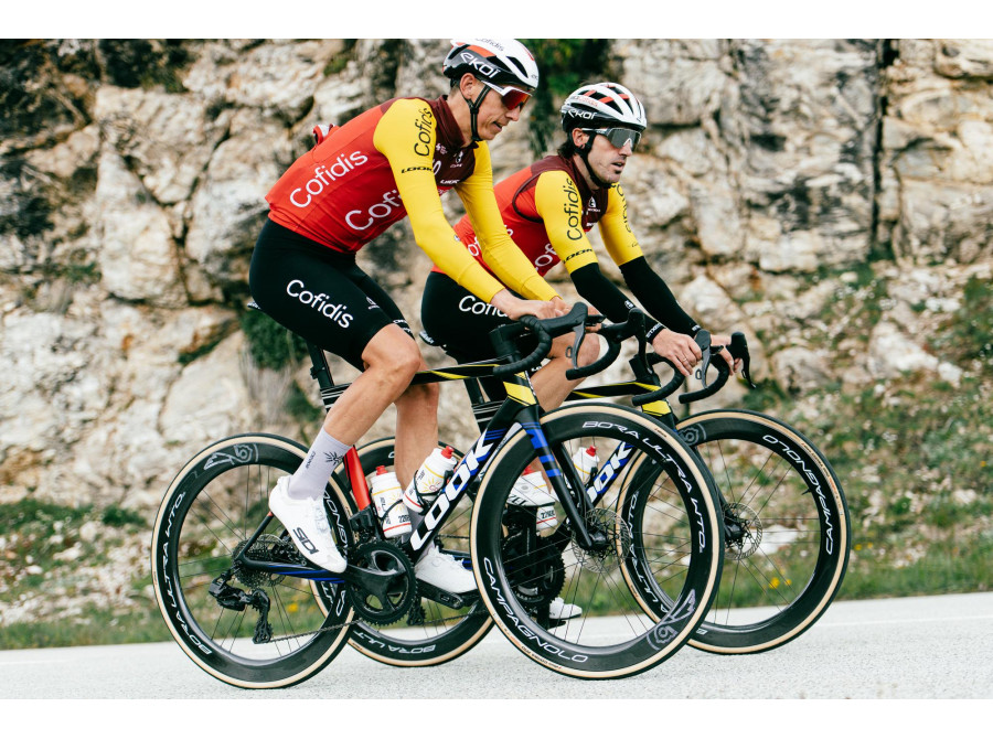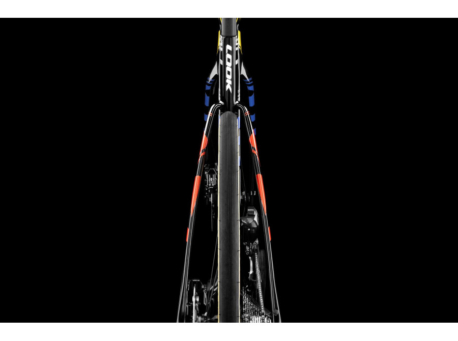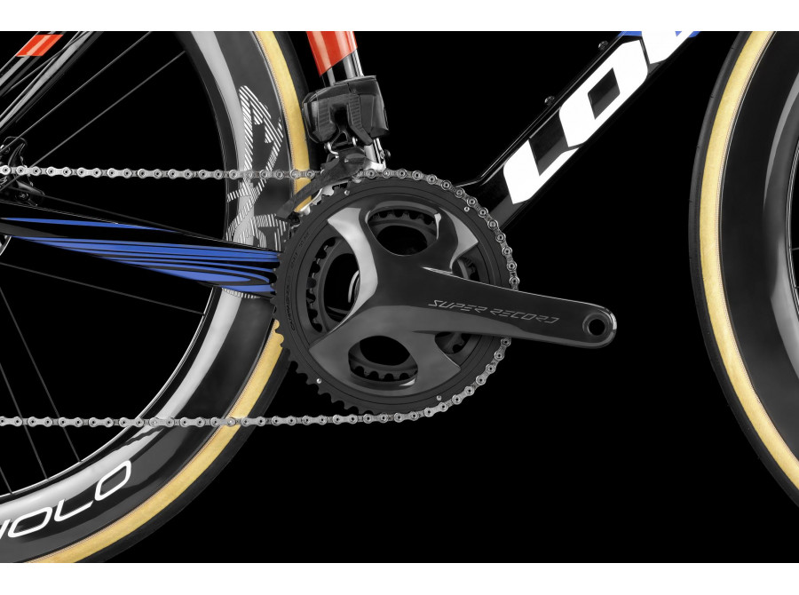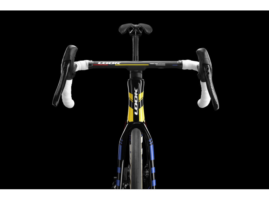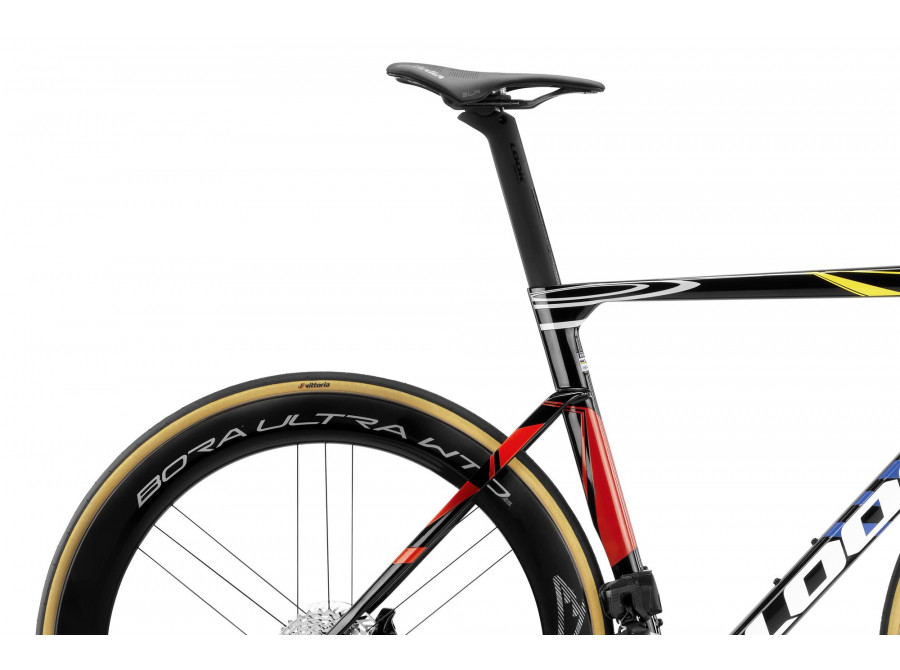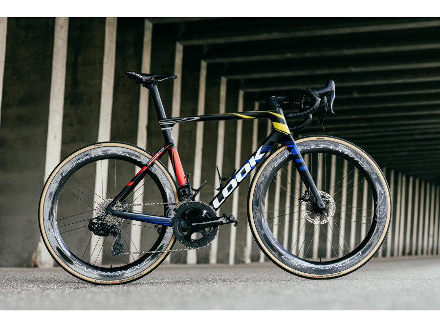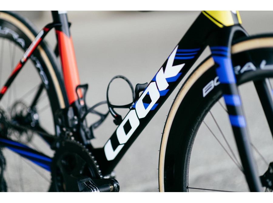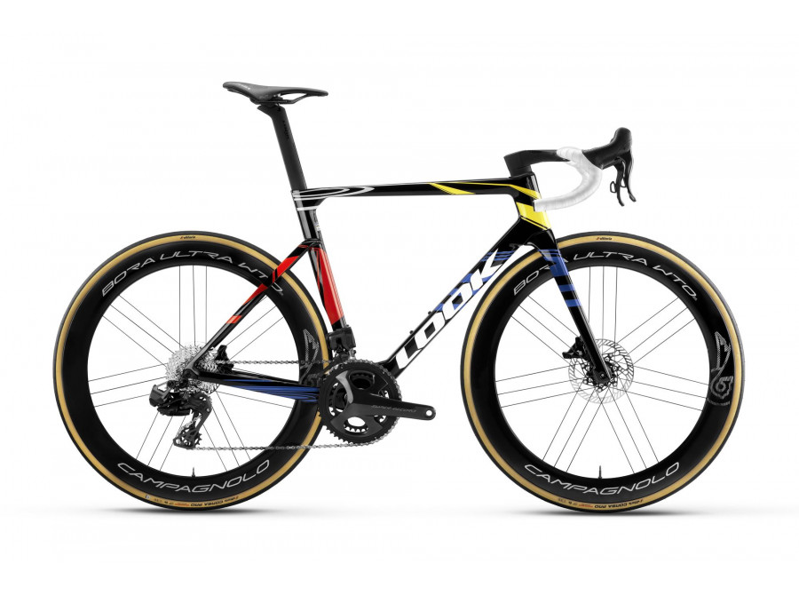 O perfektní přenos výkonu a aerodynamiku se starají karbonová kola Campagnolo Bora Ultra WTO 60 Team Edition ve speciální závodní barevné úpravě, obutá do plášťů Vittoria Corsa Pro. Kombinace, kterou ocení každý, kdo jede na hraně. Čistě černý lak ušetří 40 gramů a nechává vyniknout ikonickým barevným akcentům inspirovaným Mondrianovým stylem, který je pro značku LOOK typický.