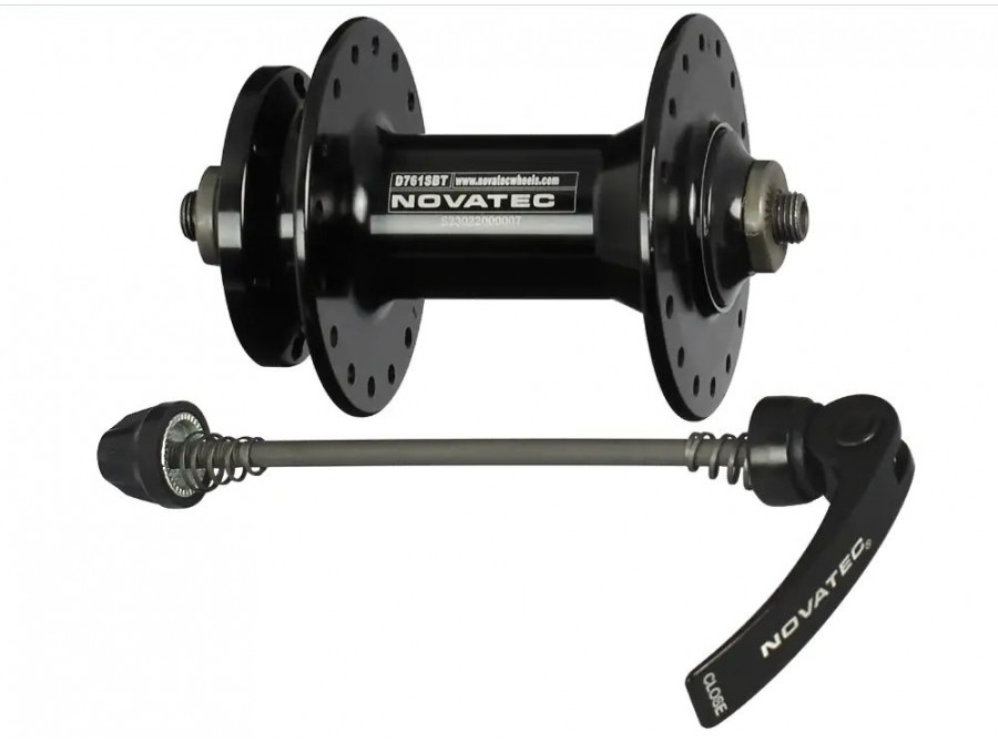 Přední náboj D761SBT ze slitiny, eloxovaný černý 32H/14G s laserem vygravírovaným logem CN Novatec, 2xNBK ložiska, 9x108x100 s QR270-112L, eloxovaný černý, bez loga, OEM