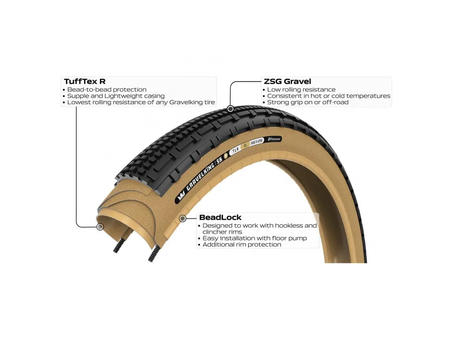 Zcela nový GravelKing SK-R si zachovává osvědčený vzorek běhounu, ale přidává špičkové technologie, které umožnily vytvořit doposud nejlehčí a nejvýkonnější pláště v rámci nabídky Panaracer. Zatímco nadále využívá spolehlivou směs ZSG Gravel Compound, verze R-Line je vybavena novým pláštěm TuffTex-R, který je poddajnější než standardní verze. Výsledkem je výrazná úspora hmotnosti bez kompromisu v jízdních vlastnostech, které jsou charakteristické pro každý plášť GravelKing.