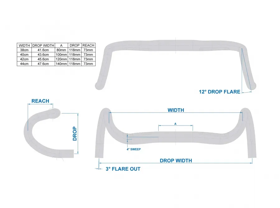 Model Butano se vyznačuje mělčím dropem (118 mm) pro lepší dostupnost a kontrolu, ať už držíte řídítka v obloucích, nebo za páky. Vyosení spodní části o 12° (flare) se stalo standardem moderních silničních a gravelových řídítek. Komfort dále zvyšuje ergonomicky tvarovaná horní část s mírným záklonem 4° (backsweep) a krátký dosah (73 mm reach).