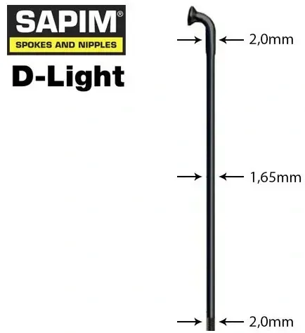 Oboustranně zesílené paprsky se specifickým profilem, který definuje jejich vysokou pevnost. Požadavky špičkové kvality pro MTB kola jsou následující: Maximální síla Minimální hmotnost Rozumná cena Schválení pro kotoučové brzdy Snadná stavba kolo ručně Specielní paprsek pro MTB kola. Krátká 2mm část d-Light snižuje hmotnost a to zejména na závitové straně. 2mm část začíná hned na začátku závitu. Z tohoto důvodu je zvláště snížena rotující hmota na konci paprsku. To přináší výhody jak při zrychlení, tak při brzdění kola. Použití 14G niple nabízí širokou škálu kombinací. Střední část má průměr 1,65mm, což paprsku dává mnohem větší tuhost a menší kroucení ,než je tomu u 1,5mm silné střední části. Rozměr 2,0-1,65-2,0 Vyráběné délky 135-310 mm Váha (64 kusů 260mm) 307 g Materiál 18/8 AISI 302 Pevnost v tahu (uprostřed) 1370 N/mm2 Provedení stříbrná nebo černá