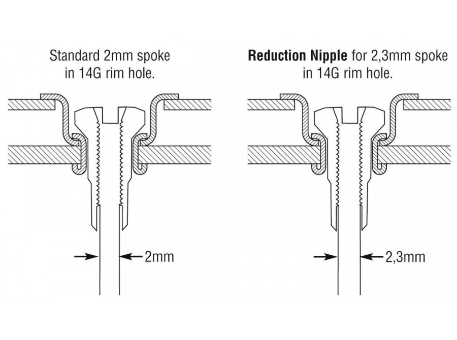 Pomocí redukčního niple můžete kombinovat 14G ráfek s 13G niplem nebo 13G ráfek s 14G niplem.
