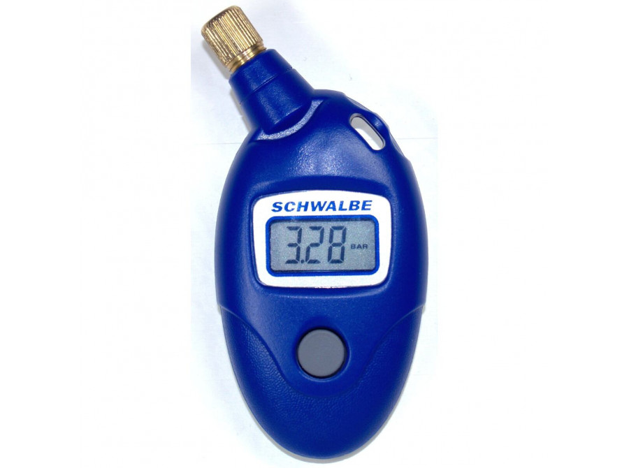 Digitální měřič tlaku je velmi přesný.Měří tlak do 11 bar a je určen pro galuskové a autoventilky.Měří i klasické ventilky ale pouze se Schwalbe vložkou Tip:kontrolujte tlak nejméně jednou za měsíc manometrem.Rozšířená kontrola tlaku pouhým stiskem prstů je velmi nespolehlivá.Již při polovičním doporučeném tlaku jsou pláště přetěžovány.Výsledkem tohoto rozšířeného nešvaru je neúměrně zvýšený valivý odpor a předčasné ojetí pláště. Tlačítko držte stisknuté : zapnutí.Mazat >vypnout>reset. Tlačítko stisknout krátce : výběr měř.jednotek (bar,PSI,KPA,kg/cm2) Správný tlak je závislý na šířce pláště a jeho zatížení.Tabulka je orientační pro 75 kg těžkou osobu.Jste-li těžší nebo jezdíte se zavazadly zvyšte tlak. Jste-li lehčí nebo chcete více pohodlí, můžete tlak snížit.Nikdy však nepřekračujte nejvyšší a nejnižší hodnoty uvedené na plášti.Tlak kontrolujte minimálně jednou měsíčně!