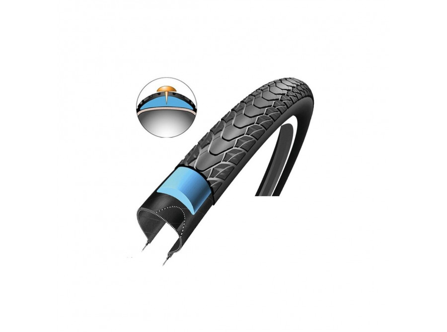 Neprorazitelný plášť pro vozíky. Marathon je momentálně absolutně referenční plášť sochranou pro vozíky.Ochranný pás SmartGuard je vyráběn zčásti z recyklovaného přírodního kaučuku.Bok Anti-Aging snese typické přetížení vzniklé nedostatečným tlakem, podstatně déle.