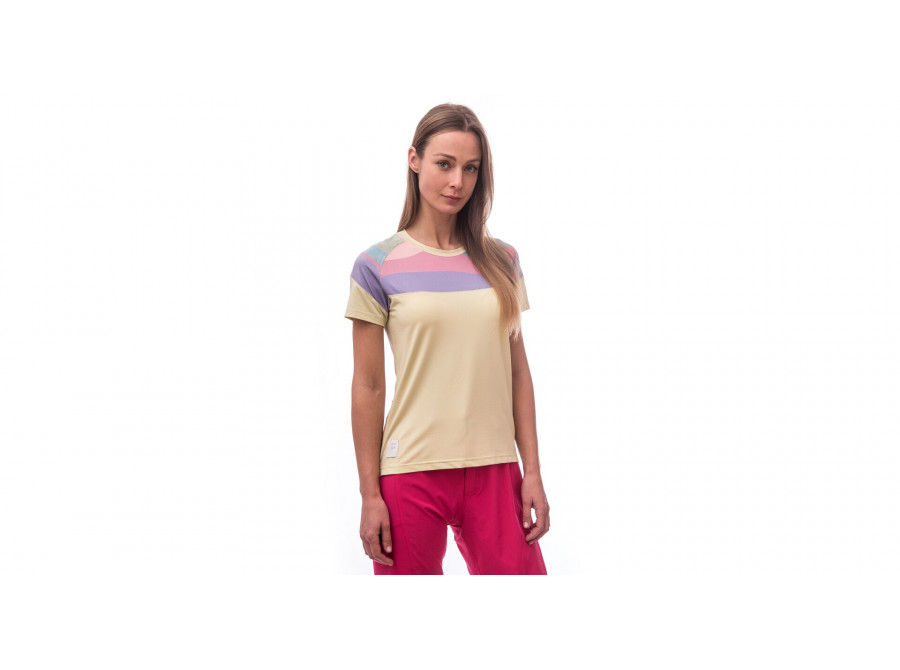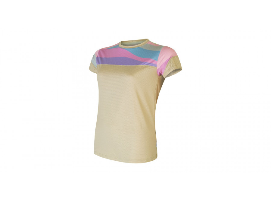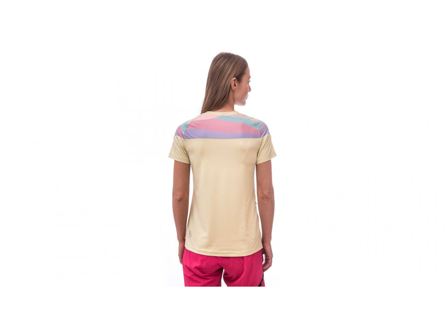 Dámský cyklistický dres s barevnými motivy. Skvělé funkční vlastnosti díky použitému materiálu s UV ochranou UPF25. Dres má volný střih s hlavicovými rukávy. Postranní kapsa na zip pro uložení drobností.