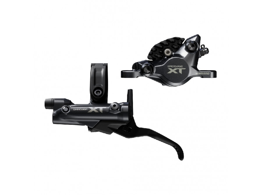 Hydraulická kotoučová brzda Deore XT M8200. Skládá se z páky BL-M8200, třmenu BR-M8200 a hadičky SM-BH90. Brzdy jsou naplněny minerálním olejem s nízkou viskozitou a odvzdušněny. Objímka páky kompatibilní pro montáž řazení s úchytem
