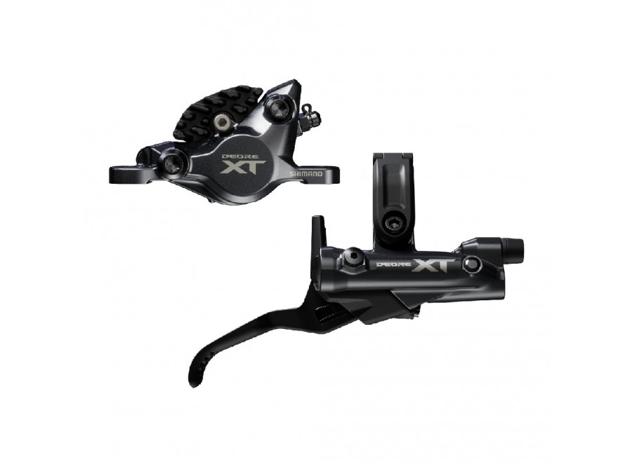 Hydraulická kotoučová brzda Deore XT M8200. Skládá se z páky BL-M8200, třmenu BR-M8200 a hadičky SM-BH90. Brzdy jsou naplněny minerálním olejem s nízkou viskozitou a odvzdušněny. Objímka páky kompatibilní pro montáž řazení s úchytem