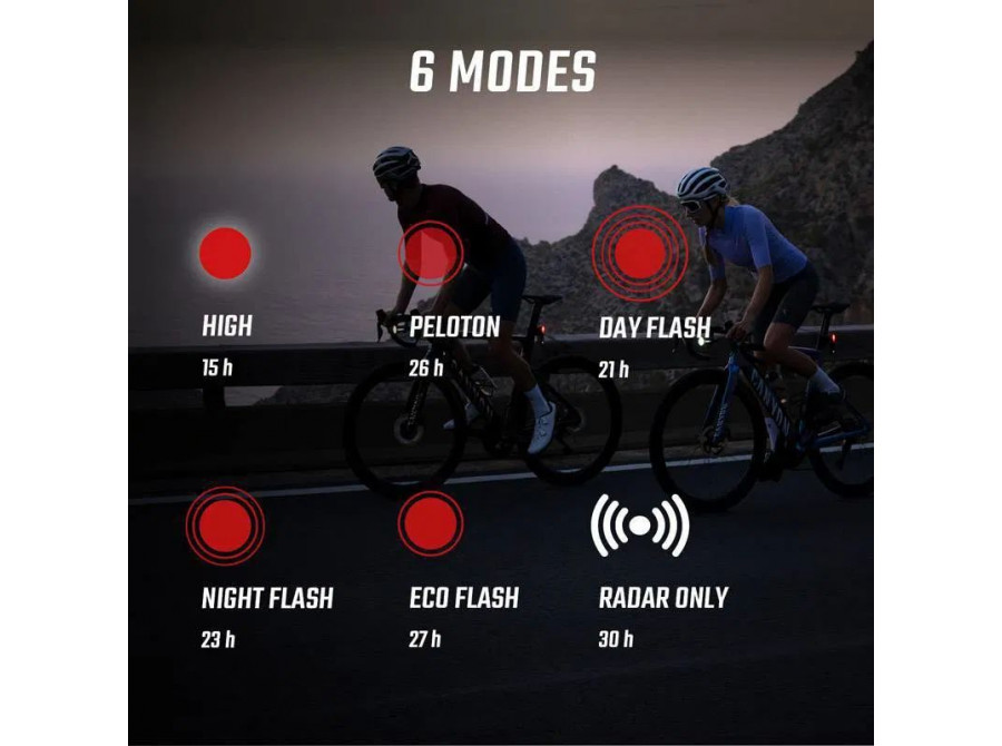 Dosah radaru až 160 m, detekce až 8 vozidel | ANT+ kompatibilita + BLE připojení (SIGMA RIDE) | Viditelnost až 500 m, 6 režimů světla |