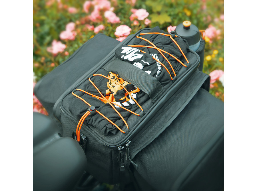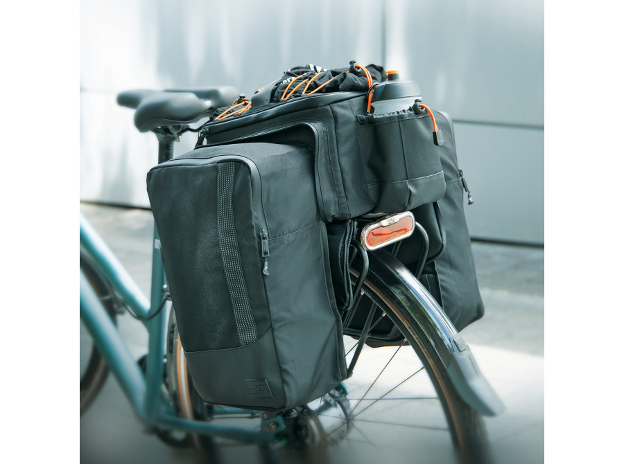 Už žádný chaos ve vaší brašně! Přihrádka vzadu, vnitřní přepážka a síťovaná přihrádka v horní části brašny vytvářejí pořádek a umožňují rychlý přístup. Vršek lze plně otevřít pomocí zipu Easyzip. Dvojitá síťovaná kapsa pojme další drobnosti. Reflexní poutka jsou připevněna na přední a zadní straně pro lepší viditelnost v silničním provozu. Robustní rukojeť a ramenní popruh usnadňují přepravu brašny, i když kolo nepoužíváte. Rozsáhlou výbavu doplňuje praktický nepromokavý obal.