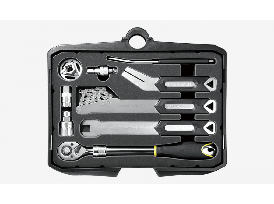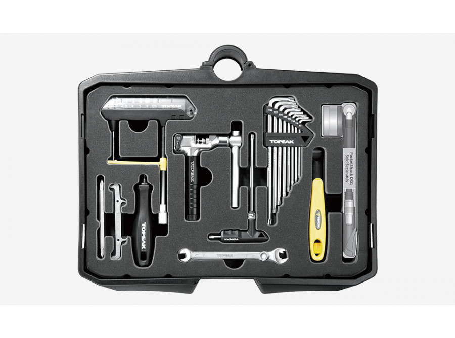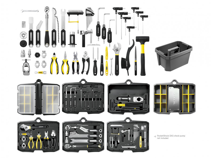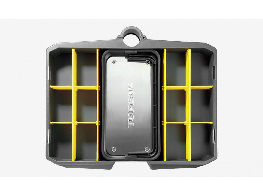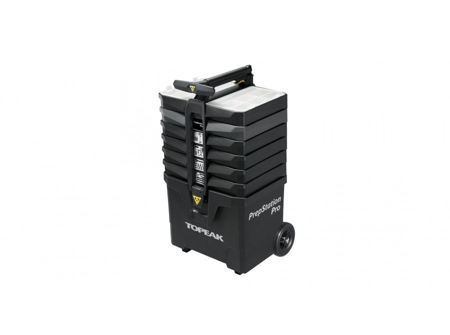Snadno přemístitelná mobilní servisní stanice na 5" kolečkách se sedmi oddíly, které obsahují 55 profesionálních cyklistických nástrojů v dílenské kvalitě (85 funkcí). Pro lepší stabilitu při práci lze základnu s kolečky jednoduše vysunout a zvětšit tak opěrnou plochu. Pomocí tlačítka na výsuvném madle (Lift Handle) se otevřou přihrádky s nářadím, což umožňuje rychlý a pohodlný přístup ke všemu potřebnému pro servis.