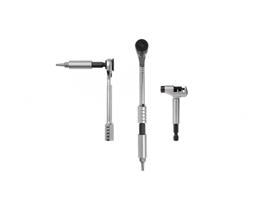 - Nástroje: Inbus 2 / 2.5 / 3 / 4 / 5 / 6 / 8 mm, Torx bity T10 / T15 / T25, šroubovák křížový #2, dvě plastové montpáky, nýtovačka z CrMo oceli, ráčna z Chromo-vanadiové oceli