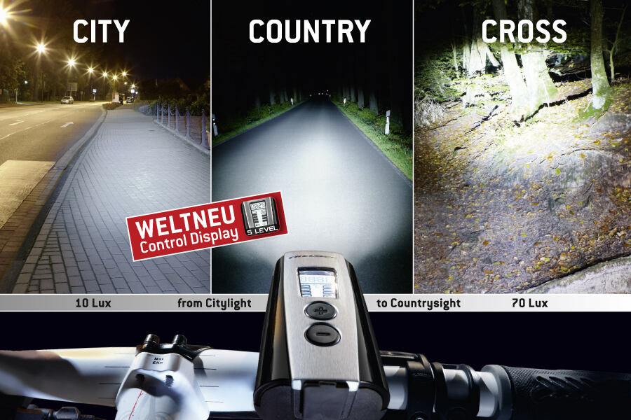 Inovativní přední světlomet s Li-ion aku baterií.Intenzita světla až 70 luxů ! Lze regulovat v pěti stupních - 10 až 70 luxů. Díky integrovanému LCD displeji lze sledovat intenzitu světla, kapacitu akumulátoru i zbývající dobu svícení. Včetně USB kabelu.