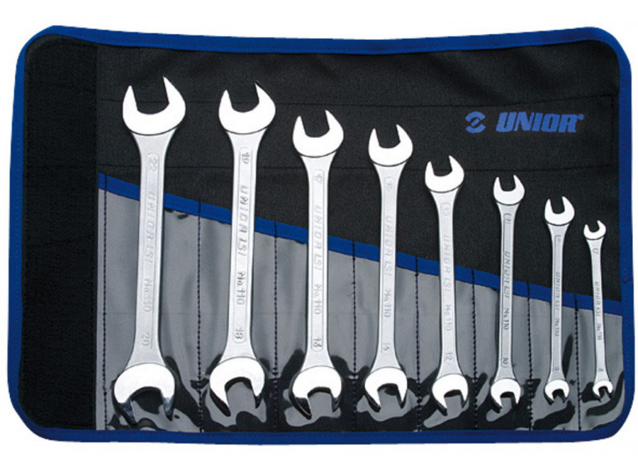 Unior Sada otevřených maticových klíčů v pouzdře, 110/1 (6 x 7), 110/1 (8 x 9), 110/1 (10 x 11), 110/1 (12 x 13), 110/1 (14 x 15), 110/1 (16 x 17), 110/1 (18 x 19), 110/1 (20 x 22)