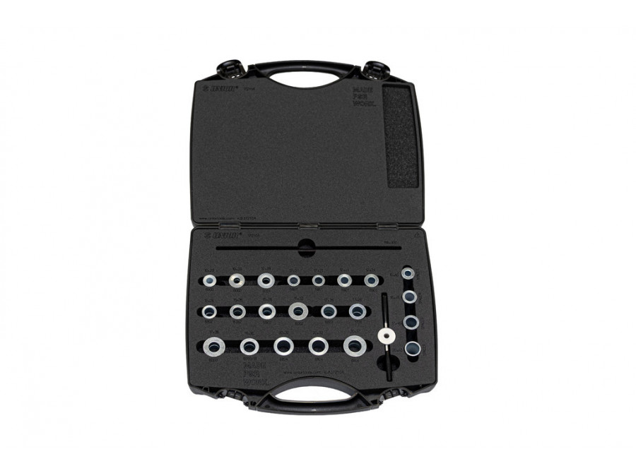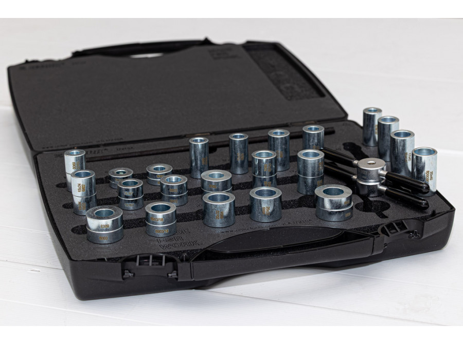 Sada je kompatibilní s širokou škálou běžně používaných nábojů s průmyslovými ložisky na trhu. Obsahuje dvě lisovací rukojeti se závitovou tyčí, adaptéry pro lisování ložisek přes osu a speciální distanční podložky pro pokrytí nejběžnějších kombinací os a ložisek.