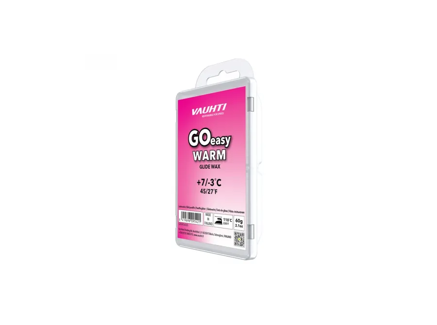 Vauhti GO EASY GLIDE WAX je tuhý vosk bez fluoruhlovodíků, navržený pro rekreační a aktivní běžkaře, kteří chtějí jednoduchou a efektivní údržbu pro všechny typy sněhu. Tento vosk se snadno nanáší pomocí žehličky nebo voskovačky, po aplikaci je potřeba nechat ho zaschnout a následně seškrábat. GO EASY WARM je ideální pro teplejší podmínky s teplotami od +7 °C do -3 °C, poskytující vynikající skluz a ochranu skluznice. Doporučená teplota žehličky pro optimální výsledky je 110 °C, což zaručuje efektivní aplikaci. S tímto voskem získáte skvělý výkon i v teplejších podmínkách!