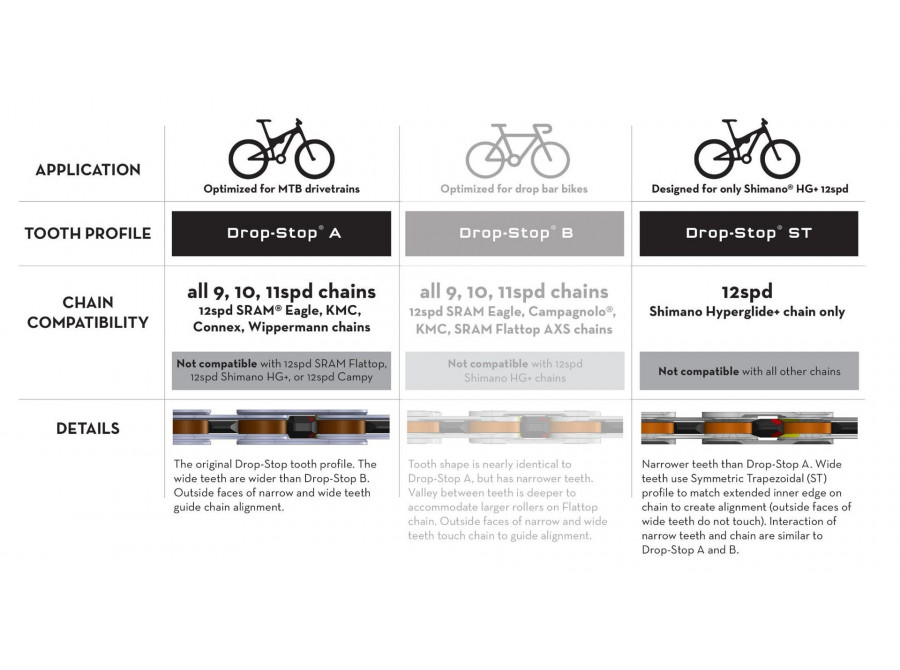 Vhodné pro 1x9 (v tomto případě doporučujeme použití s užším10-ti rychlostním řetězem pro pevnější spojení s převodníkem), 1x10 , 1x11 a 1x12 sady. K dispozici ve dvou profilech zubů v závislosti na použité sadě Sram x Shimano viz tabulka. Kompatibilní především se SRAMEM T-TYPE. POZOR, není kompatibilní s 12s Shimano HG+, 12s KMC, 13s Campagnolo.