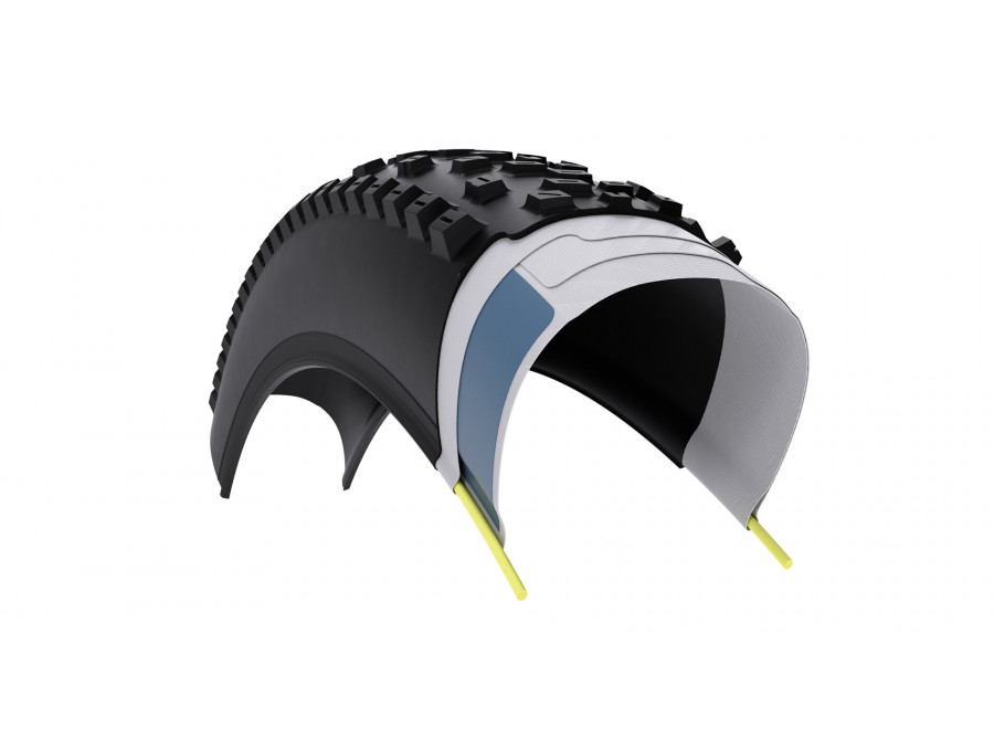 Minimální, rychlý vzorek běhounu obepíná širokou kostru, což zvyšuje trakci a jistotu bez zbytečné zátěže v podobě masivních výstupků. Minimální přesah vzorku přes hranu navíc snižuje hmotnost, zatímco kulatý profil pláště zajišťuje plynulé zatáčení na pevném podkladu (hardpack).