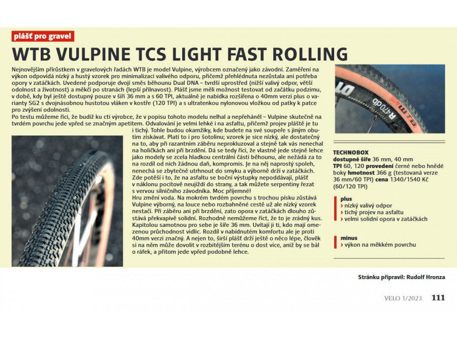 Vulpine je nejnovějším závodním přírůstkem do řady oblíbených gravel plášťů WTB. Těsně rozmístěný středový vzorek tvoří téměř nepřerušovanou středovou linii pro snížení valivého odporu, zatímco zbytek běhounu je plný krátkých výběžků, které dále zvyšují efektivitu, minimalizují možnost proražení a poskytují předvídatelnou trakci v zatáčkách. Vulpine upřednostňuje maximální efektivitu, aniž by obětoval trakci ve stoupání nebo při brzdění. Je dokonalou pneumatikou pro gravel závodníky i každodenní jezdce, kteří hledají skvělou pneumatiku, která vynikne na mnoha površích.