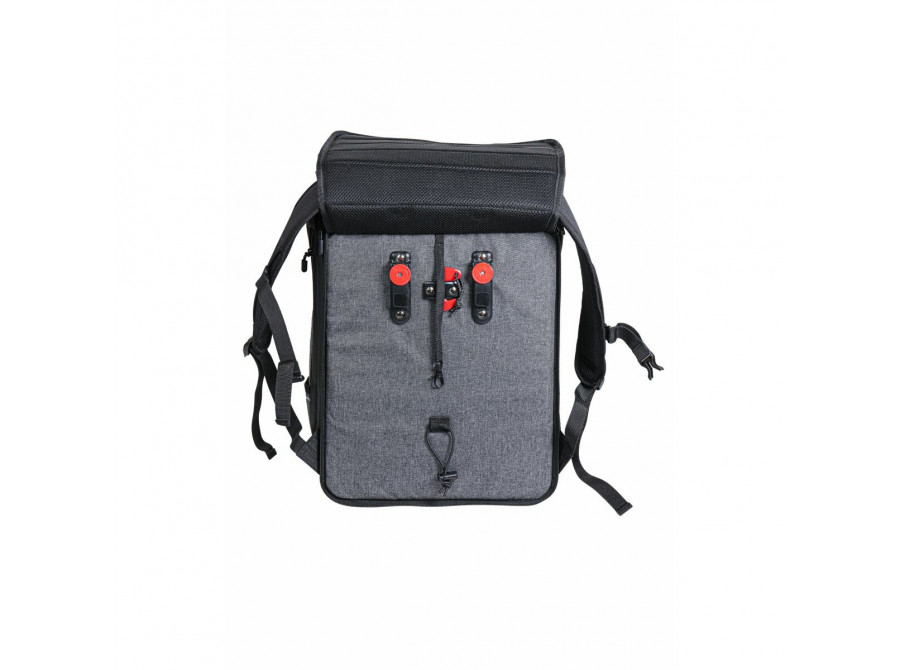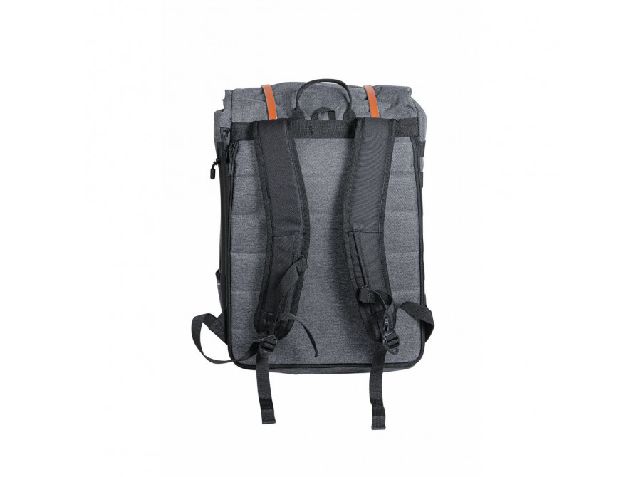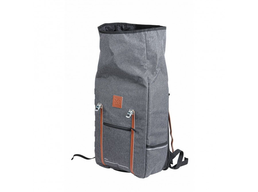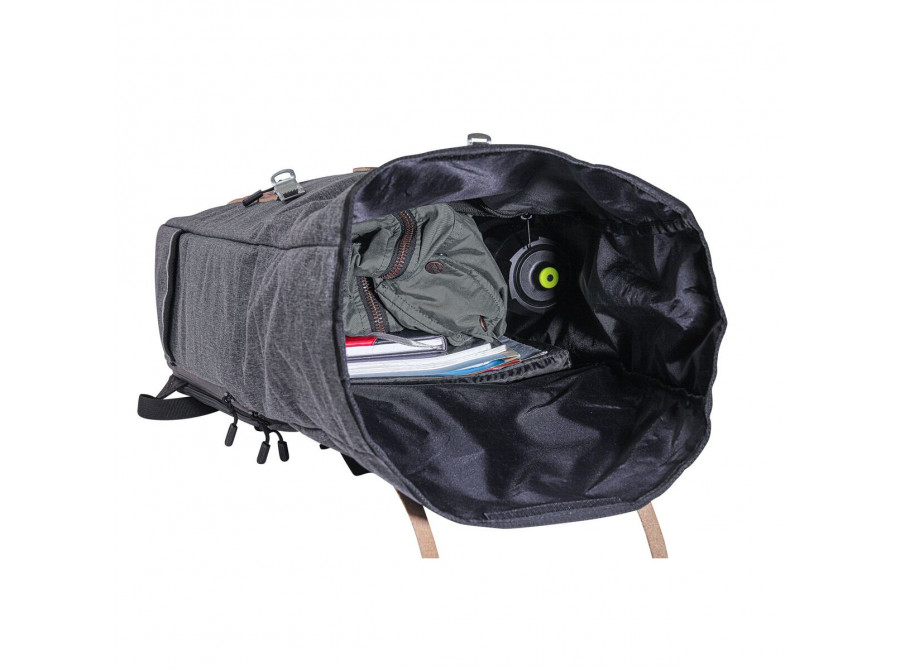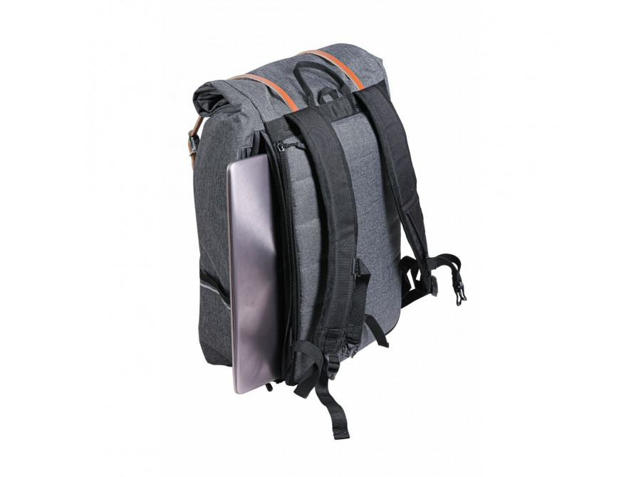 15ti palcový notebook , nebo velký objem menších předmětů. Roll top uzavření s koženými pásky umožňuje přístup do hlavní přihrádky bočním otvorem a snadný přístup k notebooku. Je vybaven další vnitřní přihrádkou a malou vnější kapsou.Vodotěsný zip. Na jedné straně popruhy umožňují připevnění U-zámku. Pod taškou je elastická pláštěnka, kterou lze v případě deště rozvinout a chránit tašku.Hrudní popruh je pro větší pohodlí výškově stavitelný.