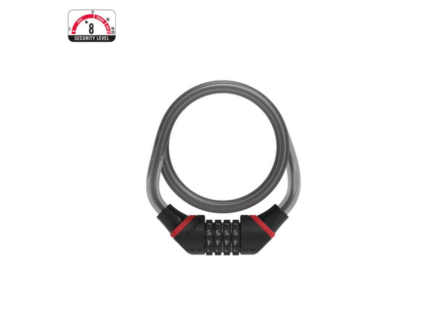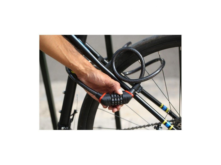 Spirálový kódový zámek, délka 185 cm, průměr 12 mm. Včetně držáku pro rámy průměru 18-36 mm.